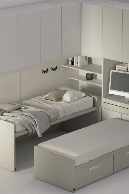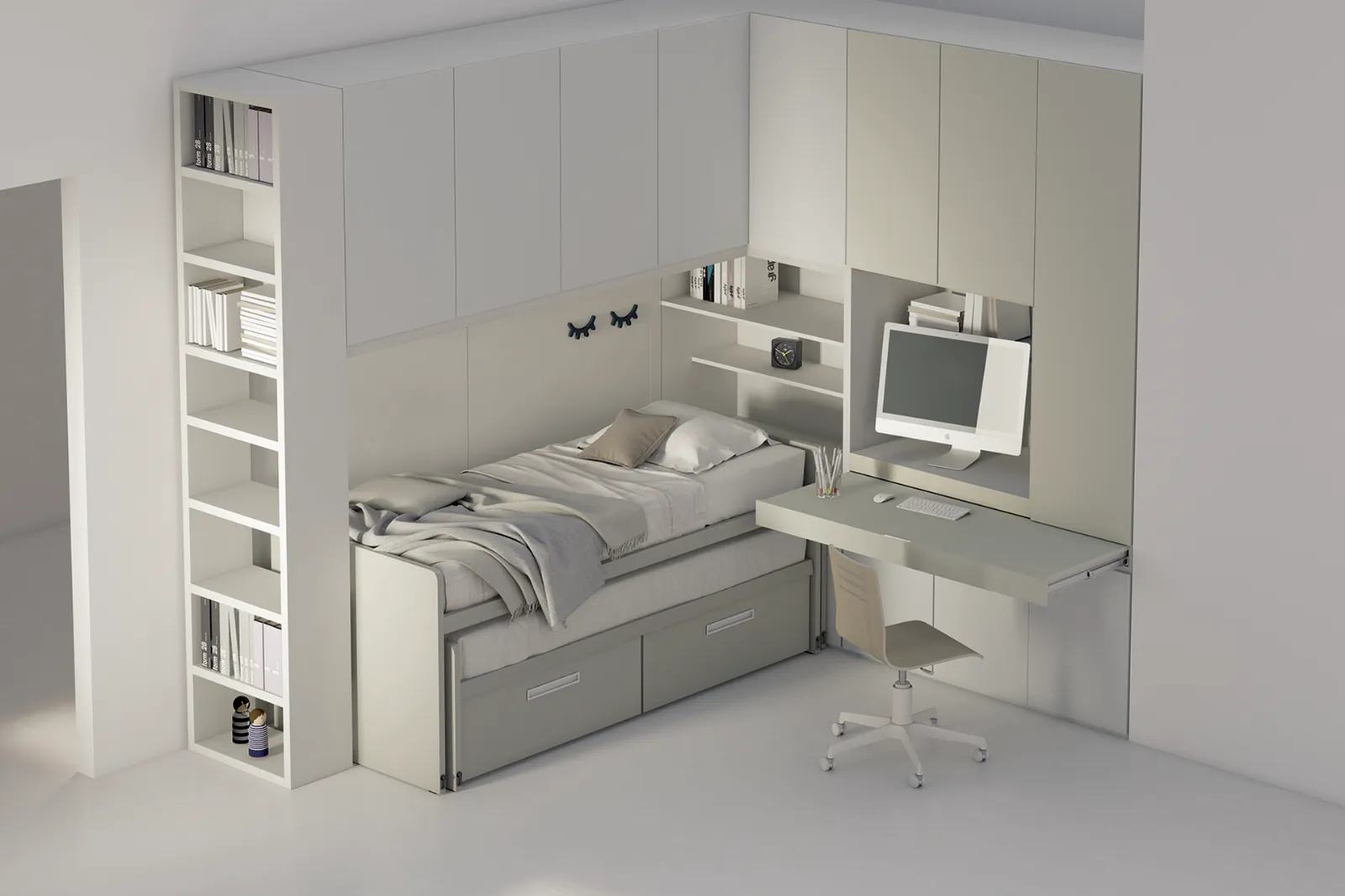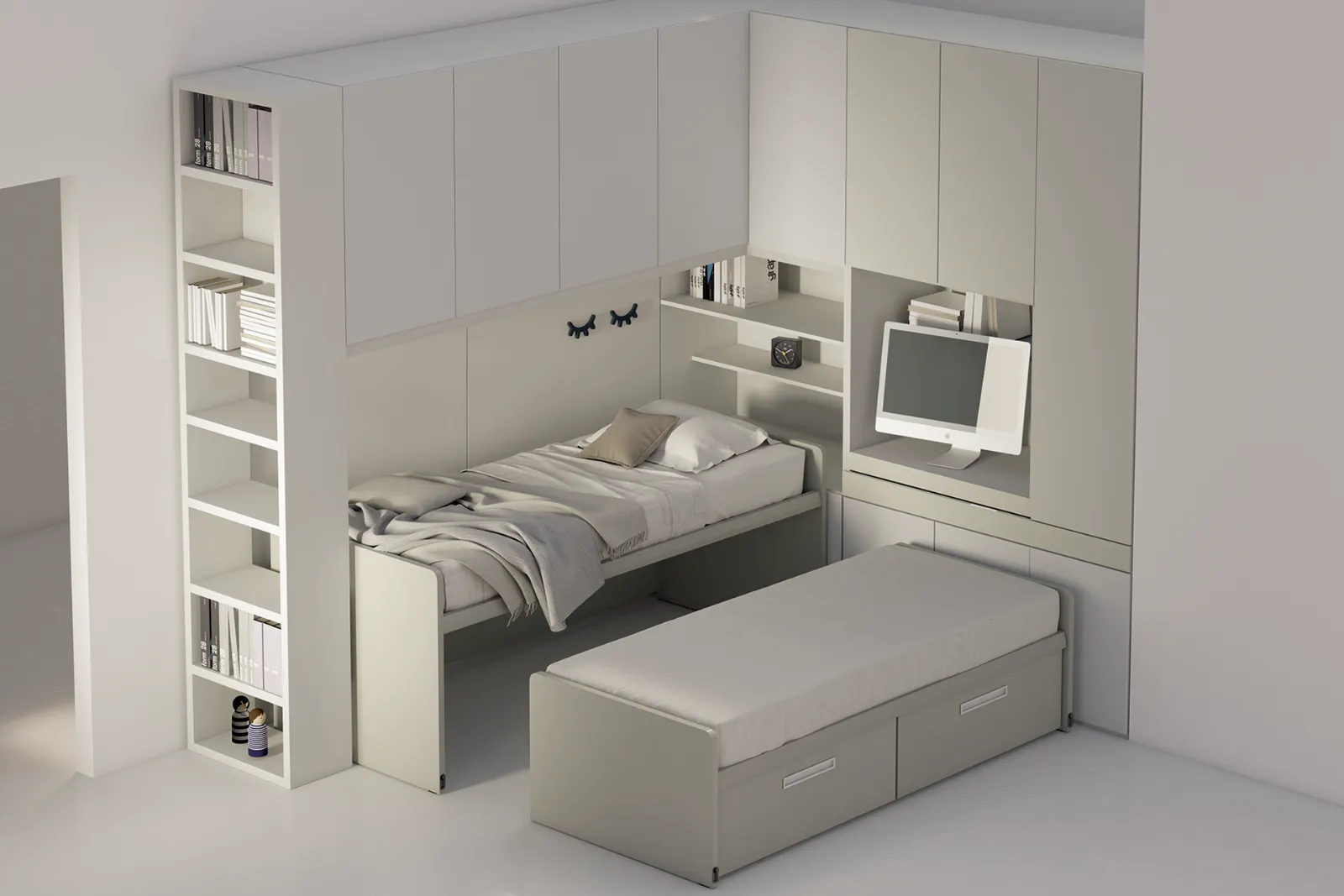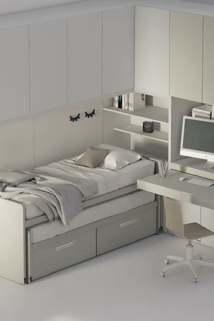The angular modularity is one of the pluses of the modularity offered by our bridge bedrooms. In this composition we propose a large wardrobe that ends on one side with a bookcase element and surmounts two beds, one of which is sliding.