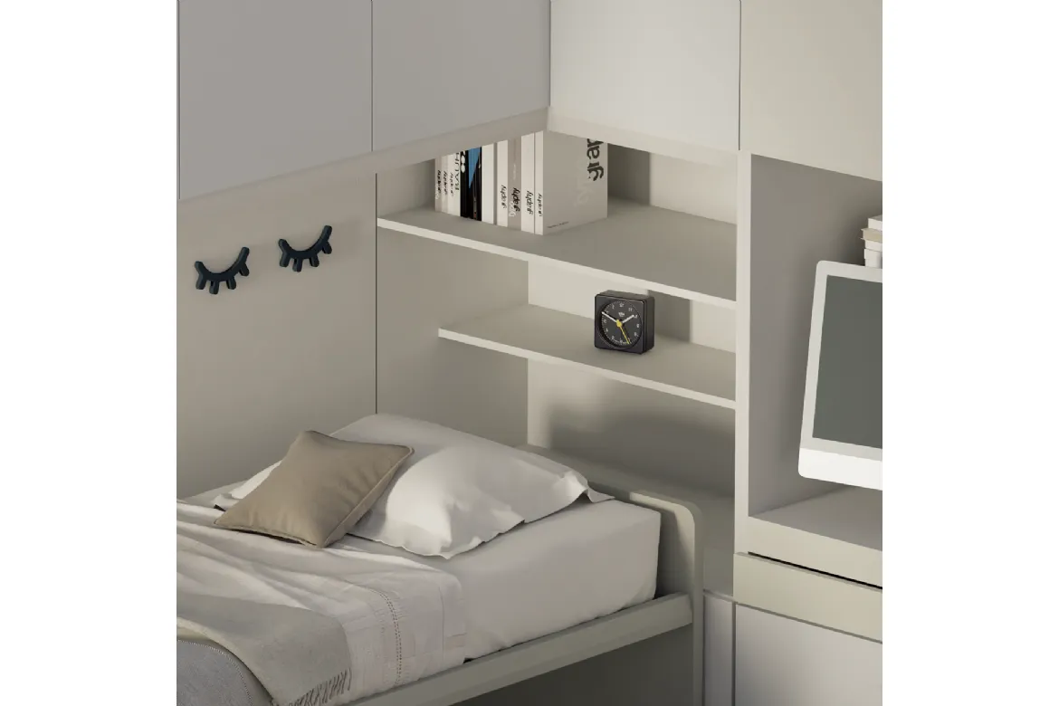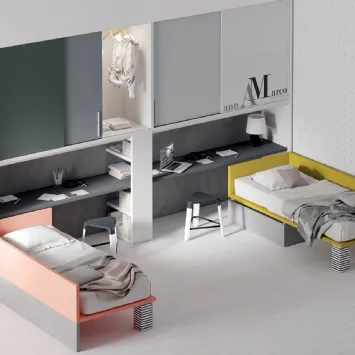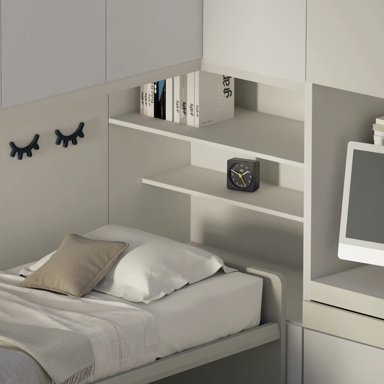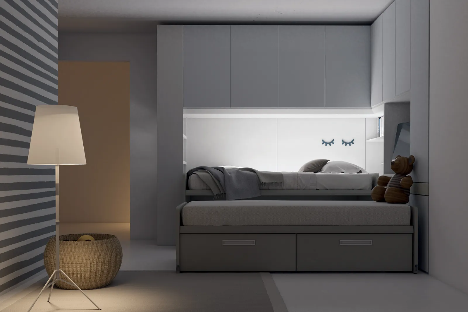 The angular modularity is one of the pluses of the modularity offered by our bridge bedrooms. In this composition we propose a large wardrobe that ends on one side with a bookcase element and surmounts two beds, one of which is sliding.