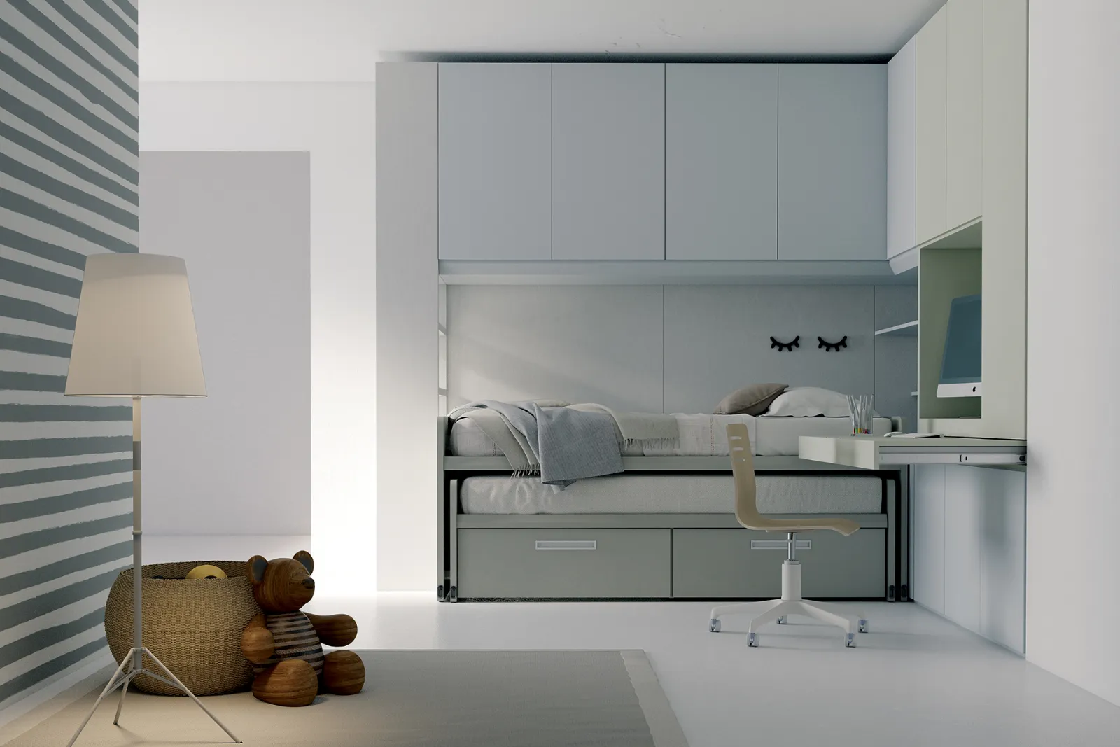 The trundle beds and small containers are mounted on wheels for easy movement. This allows in a few seconds to radically change the arrangement of the elements by configuring beds and containers as desired. In the area under the bridge c& # 39; è space for up to three beds, thanks to Arkimede pull-out beds. The overlapping of the beds makes it possible to recover up to four square meters of space with an obvious advantage for freedomà of movement in the environment. The practical shelves under the bridge offer a valid service support to the beds and the desk. Even the freestanding desk on wheels può be housed under the bridge or outside the composition.